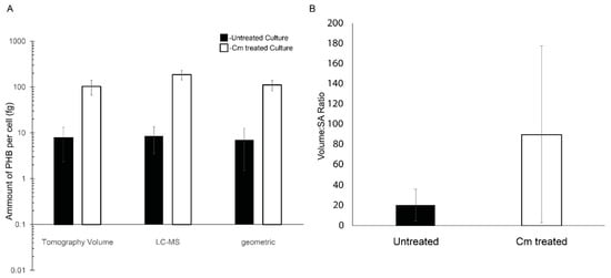 Cellular PHB was also quantified by LC-MS. This analysis showed that for 10 mg of dry cell mass, the PHB mass was ~130 µg for untreated cells and ~607 µg for Cm-treated cells. The quantity of PHB extracted was 1.2% of the total biomass of the untreated culture and increased to 6.0% of the total biomass of the Cm-treated culture. On a per-cell basis, in the untreated culture, there was approximately 8.5 femtograms (fg) (±5.0 fg) of PHB accumulated per cell, compared to 186 fg (±42 fg) of PHB per cell from Cm-treated cultures (Figure 4A). This represented a ~21-fold increase in PHB content when cells were in a growth-arrested state due to treatment with Cm.