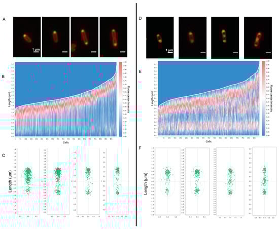 Fluorescence microscopy of PHB granules in Rba. sphaeroides. For fluorescence visualization of PHB, the PHB-associated protein PhaP was fused to mNeonGreen. Panels (A–C) show data from untreated cells (n = 950 cells) and panels (D–F) show data from Cm-treated cells (n = 895 cells). Panels (A,D) are representative images of cells from the condition. mNeonGreen-PhaP fluorescence is shown in green and cell membranes, stained with FM 4–64, are depicted in red. Scale bars are 1 μm. Panels (B,E) represent a heatmap of mNeonGreen fluorescence plotted relative to cell length, with the brightest fluorescence oriented to the top pole. Panels (C,F) show the localization of fluorescent foci for cells from untreated and Cm-treated samples based on cell length.