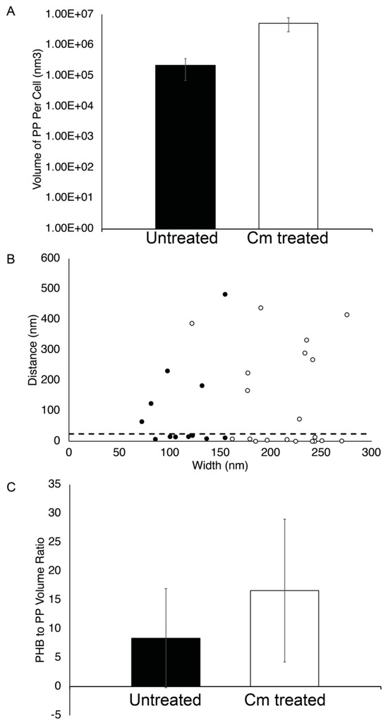 PP granule properties. (A) The volume of PP per cell was calculated using segmentation models and plotted for Rba. sphaeroides cells that were untreated (black bar, n = 23 granules in 22 cells) or Cm-treated (white bar, n = 26 granules in 20 cells). The y-axis is a logarithmic scale. (B) The distance between PP and PHB granules located at the same pole was measured for untreated and Cm-treated cells, plotted as a function of PP granule width. A dotted line indicates where 25 nm is located on the y-axis. (C) The ratio of PHB volume to PP volume per cell was calculated from segmentation modes and plotted for Rba. sphaeroides cells untreated (black bar, n = 23) or Cm-treated (white bar, n = 26).