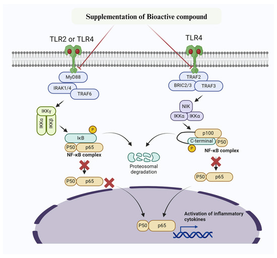 Bovine mastitis is commonly treated with antibiotics, but the excessive and indiscriminate use of antibiotics may contribute to antimicrobial resistance [47,48]. In order to combat this resistance, researchers are exploring alternative options to prevent bovine mastitis [48,49,50,51,52,53]. Recent studies have identified several bioactive compounds and probiotics that show promise in preventing and treating mastitis [35,41,54,55,56,57,58]. These compounds have been found to regulate the expression of key signaling molecules involved in the inflammatory response of mammary gland cells. More specifically, they appear to inhibit the activation of the NF-κB and TLRs signaling pathways [41,55,58], which play a crucial role in initiating and propagating inflammation in the mammary gland. These inflammatory processes are recognized as the main pathological mechanisms in mastitis development. Based on available data, this review aims to summarize the research progress on the critical role of TLR2/TLR4/NF-κB signaling pathway activation in the prevention and treatment of mastitis. Additionally, it delves into the details of how probiotics and bioactive compounds can mitigate mastitis by targeting the NF-κB signaling pathway.