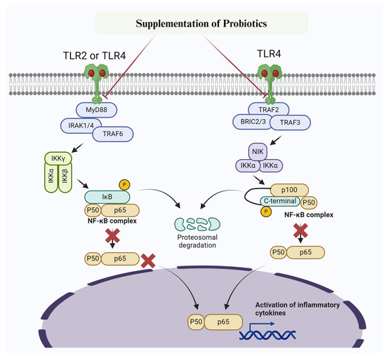 Probiotics are live microorganisms that, when consumed in sufficient amounts, provide health benefits to the host [108]. They exert their positive effects through various mechanisms, such as modifying the composition of the local microbiota or directly acting on pathogenic microorganisms. Probiotics can adhere to and interact with epithelial cells, improving their barrier function and promoting cell renewal. Additionally, they can enhance the host’s immune system response [109,110]. Touza-Otero and colleagues have previously published a comprehensive review on the role of probiotics in relieving mastitis [47]. However, this study specifically examines the molecular mechanism of probiotics in preventing mastitis, with a particular emphasis on targeting the NF-κB signaling pathway.