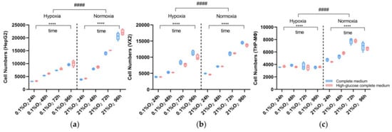 Viability assay for liver cancer cells (HepG2, VX2) and macrophages (THP-MΦ) incubated under normoxia or hypoxia with complete medium (blue box) or high-glucose complete medium (red box); all cell lines share the same legend. (a) HepG2 cell (b) VX2, and (c) THP-MΦ proliferation is displayed over 96 h. Three-way ANOVA was used for this analysis. ****, p < 0.0001 represents comparisons of the cell number changes over time within the groups (normoxic or hypoxic conditions) and ####, p < 0.0001 represents comparisons of the two groups for normoxia and hypoxia.