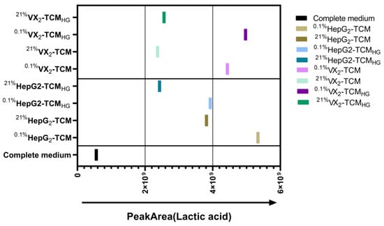 Compared to the high-glucose complete medium, the peak area of lactate (Figure 4) in the TCM was significantly and at least 2-fold higher, and the group with the highest increase exceeded 5-fold the original lactate peak. Additionally, the lactate peak area metabolic results showed increased lactate levels in the TCM of both liver cancer cell lines (VX2 cand HepG2) incubated under hypoxia as compared to normoxia. The lactate levels were comparable in the TCM from regular as compared to high-glucose complete medium in VX2, while 0.1%HepG2-TCM was a little higher as compared to 0.1%HepG2-TCMHG.
