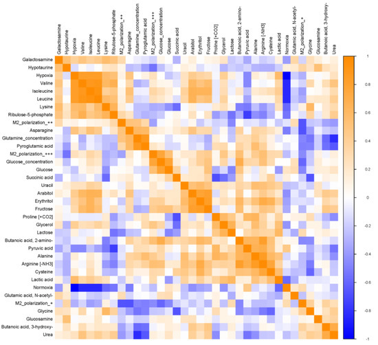 The heat map (Figure 5) shows the correlation of the major components of metabolites in TCMs collected from tumor cells cultured under different conditions with oxygen supply, glucose concentration, and M2 polarization. The correlation between each specific component is visible in the matrix. The progressively deeper orange color in the graph indicates an increasing correlation, and conversely, a darker blue color indicates a lower correlation. Specifically, when we focus on the metabolites associated with hypoxia, lysine, valine, leucine, isoleucine, asparagine, and lactic acid showed high positive correlation with hypoxia. When we focus on glucose concentration and metabolites in TCMs, the ones that have a noticeable positive correlation are as follows: isoleucine, erythritol, fructose, glycerol, pyruvic acid, Alanine, 2-amino-butanoic acid (2A-BA), Arginine [-NH3], and cysteine. Of all the metabolites, 2A-BA showed the strongest correlation with glucose concentration. It is also noteworthy that lactate was not correlated with glucose concentration. Subsequently, we focused on metabolites that were positively correlated with M2 polarization when the following metabolites increased with increasing M2 polarization (from “M2 polarization++” to “M2 polarization+++” in Figure 5) with an accompanying increase in correlation: valine, isoleucine, leucine, glucose concentration, 2-amino-butanoic acid (2A-BA), and cysteine. Among them, 2-amino-butanoic acid had the highest correlation with M2 polarization. In addition to the above metabolites, hypoxia and glucose concentration showed a tendency to affect M2 polarization more significantly.