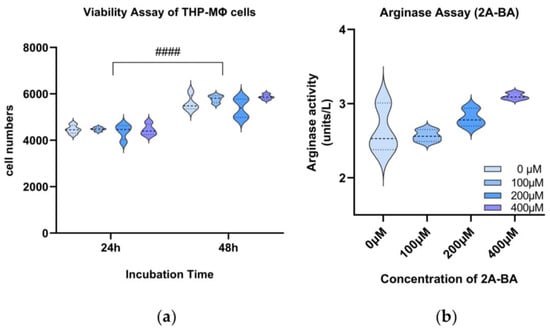 (a) Violin plots showing viability assay results for macrophages (THP-MΦ) incubated with increasing concentrations of 2-amino-butanoic acid (2A-BA) for 24 and 48 h. Two-way ANOVA was used for this analysis. ####, p < 0.0001: comparisons between two incubation time groups (24 h vs. 48 h). (b) Arginase assay for macrophages (THP-MΦ) incubated with increasing concentrations of 2-amino-butanoic acid (2A-BA). Kruskal–Wallis test was used for this analysis. p = 0.02: comparisons within a group of different concentrations of 2A-BA. (a,b) Plots share a legend and the gradual deepening of the blue color represents a higher concentration of 2A-BA.