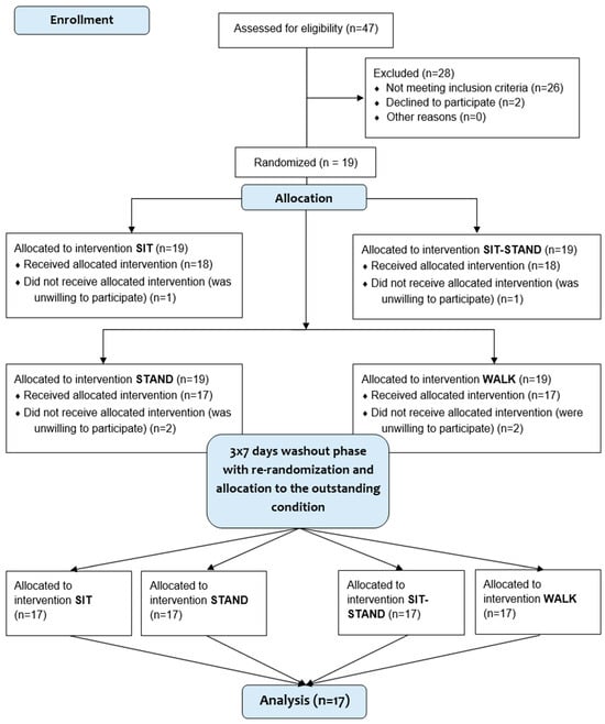 After enrolment in the study, participants were randomized to the order of simulated work conditions by a research associate that was not other involved in the study (performed by Research Randomizer® 4.0 [Social Psychology Network, Lancaster, PA, USA], 1:1:1:1) []. Participants took part in an initial screening visit and completed four 8 h simulated work and learning conditions in random order: (1) uninterrupted prolonged sitting (SIT), (2) alternate sitting and standing (SIT/STAND), (3) continuous standing (STAND), and (4) continuous walking (WALK). Always with one week in between, participants were tested within the remaining trial arms. The initial screening visit and each trial intervention were conducted at our research lab at the Bayreuth Center of Sport Science (BaySpo) of the University of Bayreuth. As shown in the CONSORT flow diagram [] (Figure 1), out of 47 people screened, 19 consented and were randomized, and 28 participants were withdrawn for not meeting the eligibility criteria. Among those randomized, 2 withdrew their participation during the first intervention for personal reasons. The final sample consisted of 17 young adults with overweight and obesity.