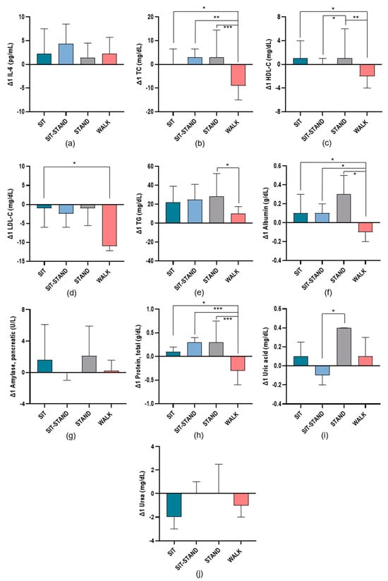 Changes in inflammatory and cardiometabolic risk markers studied in each condition Δ1(T1−T0) as follows: (a) interleukin-6 (IL-6); (b) total cholesterol (TC); (c) high-density lipoprotein cholesterol (HDL-C); (d) low-density lipoprotein cholesterol (LDL-C); (e) triglyceride (TG); (f) albumin; (g) amylase, pancreatic; (h) total protein; (i) uric acid; (j) urea. * p ≤ 0.05; ** p ≤ 0.01; *** p ≤ 0.001.