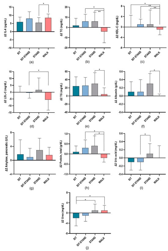 Changes in inflammatory and cardiometabolic risk markers studied in each condition Δ2(T2−T0) as follows: (a) interleukin-6 (IL-6); (b) total cholesterol (TC); (c) high-density lipoprotein cholesterol (HDL-C); (d) low-density lipoprotein cholesterol (LDL-C); (e) triglyceride (TG); (f) albumin; (g) amylase, pancreatic; (h) total protein; (i) uric acid; (j) urea. * p ≤ 0.05; ** p ≤ 0.01.