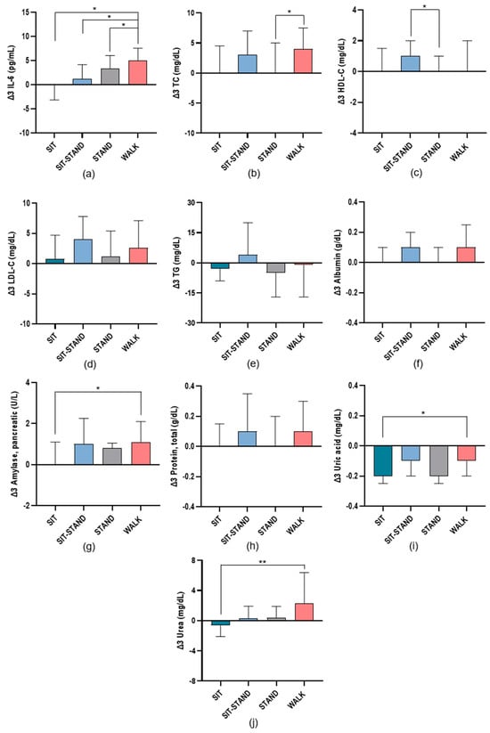 Changes in inflammatory and cardiometabolic risk markers studied in each condition Δ3(T2−T1) as follows: (a) interleukin-6 (IL-6); (b) total cholesterol (TC); (c) high-density lipoprotein cholesterol (HDL-C); (d) low-density lipoprotein cholesterol (LDL-C); (e) triglyceride (TG); (f) albumin; (g) amylase, pancreatic; (h) total protein; (i) uric acid; (j) urea. * p ≤ 0.05; ** p ≤ 0.01.