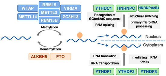 - Yang, Y.; Hsu, P.J.; Chen, Y.S.; Yang, Y.G. Dynamic transcriptomic m(6)A decoration: Writers, erasers, readers and functions in RNA metabolism. Cell Res. 2018, 28, 616–624. [Google Scholar] [CrossRef]