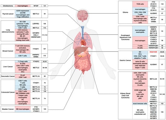 | Kidney renal clear cell carcinoma | METTL14 | CD4+ T cells, CD8+ T cells, neutrophils, natural killer (NK) cells, myeloid dendritic cells, macrophages, and B cells | NF-κB pathway | positive | Immune-checkpointinhibition, CD274(PD-L1),HAVCR2,PDCD1LG2(PD-L2),SIGLEC15,TIGIT | [91,92,93] | ||