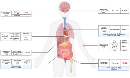 | Autoimmune Disease | m6A Regulator | Immune Cell Type | Immunity Expression | Target Gene | Mechanism | Treatment | Refs. |