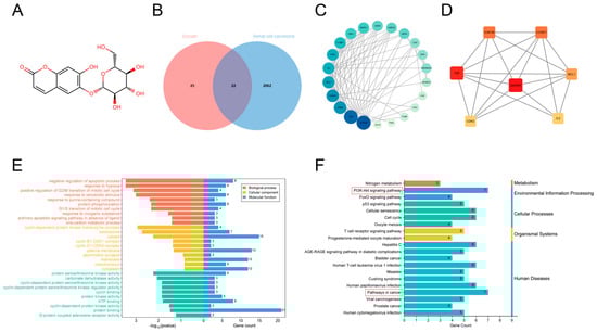 Network pharmacology analysis of esculin and RCC. (A) Chemical structure of esculin. (B) Venn diagram showing the intersecting genes between esculin and RCC. (C) PPI network of the intersecting genes between esculin and RCC. (D) Core protein targets between esculin and RCC. (E) GO analysis of the intersecting genes. (F) KEGG pathway analysis of the intersecting genes.