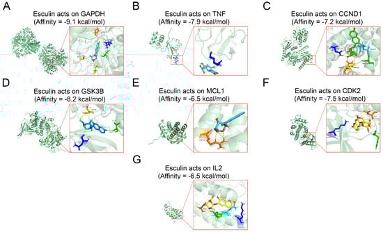 The molecular docking technique can verify the reliability of the screened core target proteins by calculating the affinity of drug–protein binding. We docked esculin with seven core target proteins after dehydrogenating and hydrogenating the protein structures and hydrogenating the esculin structure. The results demonstrated that the affinity of esculin with all the proteins was less than 0, indicating successful binding to each of them.