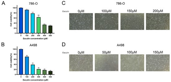 Effects of esculin on RCC cell viability. Cell viability of the RCC cells was assessed using the CCK-8 assay: (A) 786-O; (B) A498. Morphological changes in RCC cells after treatment with esculin: (C) 786-O; (D) A498. * p < 0.05, ** p < 0.01. Scale bar: 100 μm.