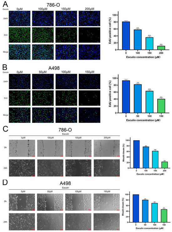 Effects of esculin on RCC cell proliferation and migration. Esculin inhibits the proliferation of RCC cells using the EdU assay with blue (DAPI) and green (EdU): (A) 786-O; (B) A498. Scale bar: 100 μm. Esculin inhibits the migration of RCC cells using the wound healing assay: (C) 786-O; (D) A498. ** p < 0.01.