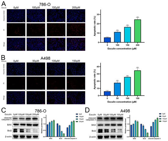 Effects of Esculin on apoptosis of RCC cells. Hoechst 33342/PI (blue/red) co-staining to detect apoptosis in RCC cells after treatment with esculin: (A) 786-O; (B) A498. Scale bar: 100 μm. Images and quantification of Western blot of cleaved-caspase-3, BAX, Bcl2 after treatment with esculin: (C) 786-O; (D) A498. * p < 0.05, ** p < 0.01.