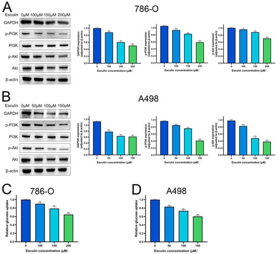 Effects of esculin on PI3K/Akt pathway and glucose metabolism in RCC cells. Images and quantification of Western blot of GAPDH, p-PI3K and p-Akt after treatment with esculin: (A) 786-O; (B) A498. Glucose uptake of RCC cells: (C) 786-O; (D) A498. * p < 0.05, ** p < 0.01.
