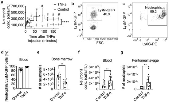 Neutrophil dynamics in TNFα-induced peritonitis. (a) Dynamic circulating concentrations of LysM-EGFP+ leukocytes (mostly neutrophils) within 3 h after TNFα or vehicle i.p. injection monitored by IVFC. IVFC measurements were performed at minutes 0, 10, 20, 30, 60, 90, 120, 150, and 180. Mean ± SEM. n = 6 mice. **** p < 0.0001 by the two-way ANOVA test. # p < 0.05 by multiple unpaired t-tests. (b,c) A representative gating of conventional flow cytometry measurements showing the percentage of LysM-GFP+ cells in blood leukocytes (b) and Ly6G+ neutrophils in LysM-GFP+ cells (c) from a mouse injected with TNFα for 1 h. (d) Conventional flow cytometry measurement showing percentages of Ly6G+ neutrophils in blood LysM-EGFP+ leukocytes at 1 h after TNFα or vehicle i.p. injection. Mean ± SD. n = 13 mice from 5 individual experiments. (e–g) Conventional flow cytometry measurement showing Ly6G+ neutrophil number in bone marrow (e), concentration in blood (f), and number in peritoneal lavage (g) from mice 1 h after TNFα or vehicle i.p. injection. Mean ± SD. n = 13 mice from 5 individual experiments. ** p < 0.01 by unpaired t-tests.