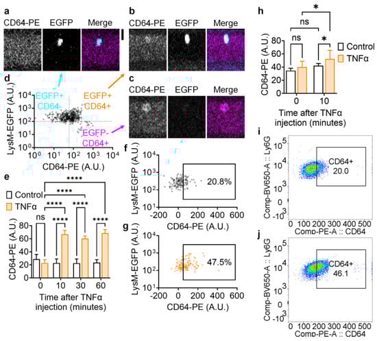 CD64, or Fc γ Receptor I, is a neutrophil activation marker, and its upregulation has been linked with peritonitis and sepsis [38,39]. We monitored CD64 expression in vivo by injecting PE-conjugated CD64 antibodies into LysM-EGFP mice (Figure 3). We observed CD64− and CD64+ neutrophils (CD64−EGFP+, Figure 3a, CD64+EGFP+, Figure 3b) as well as CD64+ non-neutrophil leukocytes (CD64+EGFP−, Figure 3c) in the circulation, which can be seen in the dot plot (Figure 3d). After TNFα injection, the neutrophils’ average CD64 expression was significantly increased by ~3 times, whereas vehicle control injection did not induce changes in neutrophil CD64 expression (Figure 3e). CD64+ neutrophils increased from ~20.8% (Figure 3f) to ~47.5% (Figure 3g) in 10 min after TNFα injection.