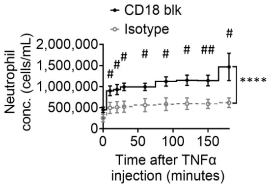 CD18, or β2 integrin, is critical for neutrophil recruitment during inflammation [40,41,42], including peritonitis [20]. Here, we blocked CD18 using antibodies and used IVFC to monitor the dynamic changes in circulating neutrophils in TNFα-induced peritonitis (Figure 4). As expected, we found that, after CD18 blockade, the neutrophil concentration in circulation increased twice compared to that in isotype control, implying that more neutrophils are retained in the circulation after CD18 blockade, and that CD18 is required for neutrophil peritoneal recruitment.