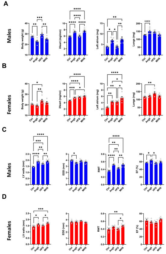 After 28 days, the MHS significantly increased both males’ and females’ heart and left atrial weights. HFD only caused CH and left atrial enlargement in females (Figure 1B). Lung congestion was evaluated by weighing lungs at the time of euthanasia. Only in females fed with the HFD did we observe an increase in lung weight.