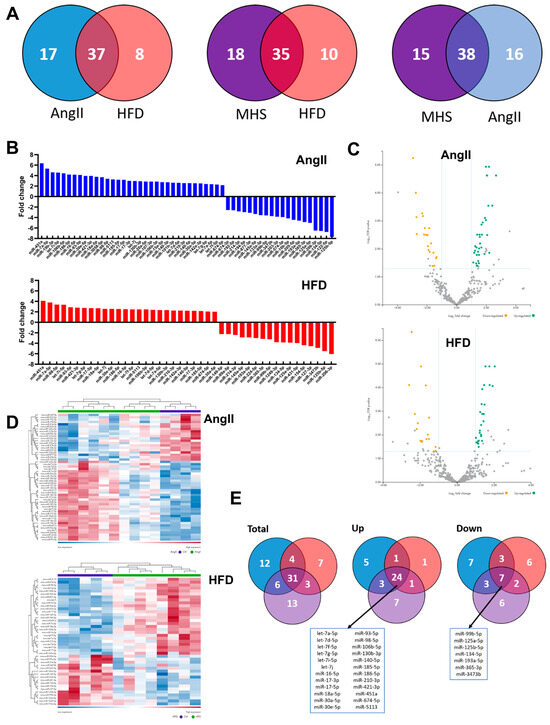 Alterations of the plasma miRNomes after four weeks of AngII, HFD or MHS. (A) Venn diagrams illustrating the number of modulated miRs between the control group and the indicated stress group. (AngII: blue, HFD: red or MHS: purple). Many modulated miRs between each stress group were common. (B) Upregulated and downregulated circulating miR after four weeks of AngII (blue) or HFD (red). Graphs represent fold change (log2) of all significantly modulated miRs (FDR < 0.05) after four weeks of the indicated stress. (C) Volcano plots of differently expressed miRs after AngII (up) or HFD (bottom). Green dots illustrate upregulated miRs, and yellow dots downregulated ones. Grey dots had a fold change below ±2 or a false discovery rate (FDR) over 0.5. (D) Heat maps of modulated miRs after AngII (up) and HFD (bottom) stress compared to control mice. Purple samples are controls, and green ones are AngII or HFD. Colours range from blue (low expression) to red (high expression). (E) Venn diagrams of modulated miRs in AngII (blue), HFD (red) and MHS (purple) compared to control animals. Thirty-one miRs are shared between the three stresses. Twenty-four are upregulated, and seven are downregulated. These miRs are listed below the Venn diagrams.