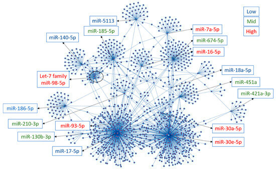 A. Interactome network of the 24 common plasma miRs with their potential target from the TargetScan database. This network was generated using the miRNet 2.0 analytical tool and Cytoscape to build the illustrated network. The location of the plasma miRs is indicated and was classed in tertiles (low, blue, mid, green, high, and red) based on their normalised counts after sequencing. Dots represent target genes.