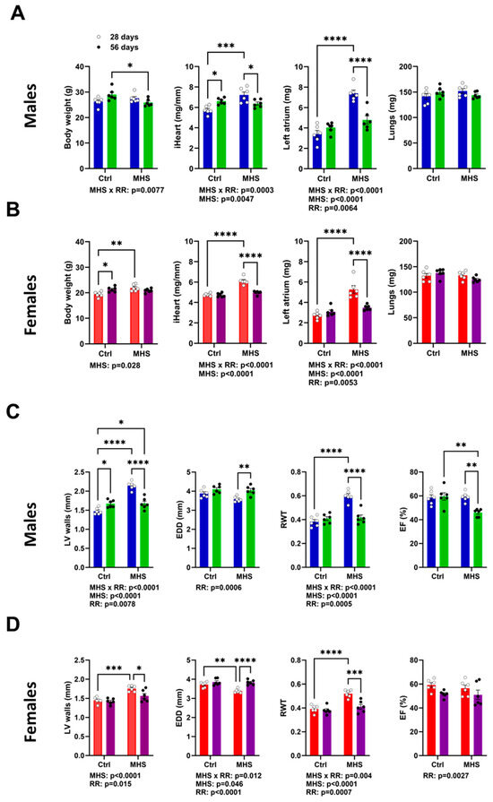 Four weeks after AngII and HFD cessation and introduction of voluntary exercise reversed cardiac hypertrophy and left atrial enlargement in male and female mice. (A) Males. Data at euthanasia (n = 6/group). Blue columns and open dots (28 days) and green columns and black dots (56 days). MHS increased heart and left atrial weight, and RR returned these parameters to values comparable to those of age-matched control mice. (B) Females. Red columns and open dots (28 days) and purple columns and black dots (56 days). MHS increased heart and left atrial weight, and RR returned these parameters to values comparable to those of age-matched control mice. (C) Males. Echo data. RR returned MHS-increased LV wall thickness to normal. This was true for the end-diastolic LV diameter (EDD) and relative wall thickness (RWT) but reduced ejection fraction (EF). (D) Females. RR returned MHS-increased LV wall thickness to normal. This was true for the end-diastolic LV diameter (EDD), and relative wall thickness (RWT) and ejection fraction (EF) were preserved. Data are represented as mean + SEM. Two-way ANOVA followed by Holm–Sidak post-test. * p < 0.05, ** p < 0.01, *** p < 0.001 and **** p < 0.0001 between indicated groups. Factors (MHS, RR of their interaction) below p < 0.05 are indicated below graphs.