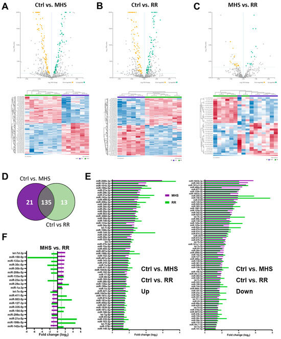 Alteration of the LV miRNome after four weeks of MHS and then RR. Volcano plots and heat map of differently expressed miRs after MHS compared to controls (A), RR compared to controls (B,C), between MHS and RR. Green dots illustrate upregulated miRs and yellow dots downregulated ones. Grey dots either had a fold change below ±2 or had a false discovery rate (FDR) over 0.5. Dark blue samples are controls (MHS in (C)), and green ones are MHS (A) or RR (B,C). Colours range from blue (low expression) to red (high expression). (D) Venn diagram illustrates the number of modulated miRs between the control group and MHS and between the control and RR groups. (MHS: purple and RR: green). (E) All miRs upregulated (left) and downregulated (right) between control and MHS (purple) or RR (green) in the LV are modulated in the same fashion. (F) Only 20 miRs are differentially modulated when comparing the LV miRNomes of the MHS group (purple) at 28 days and the RR group (green) at 56 days, and 12 of them are regulated in different directions.