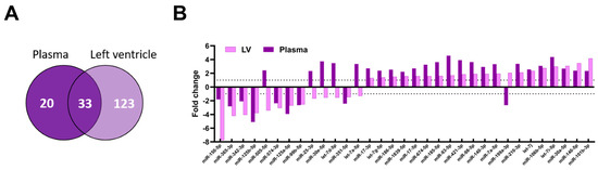 Comparison of the plasma and myocardial miRNomes. (A) Most plasma miRs modulated in the LV are also modulated in the plasma. In the LV, this represents only 21% of modulated miRs. (B). Most of the 33 common miRs between the plasma and LV miRNome of MHS-treated mice are modulated in the same direction (27 of 33).