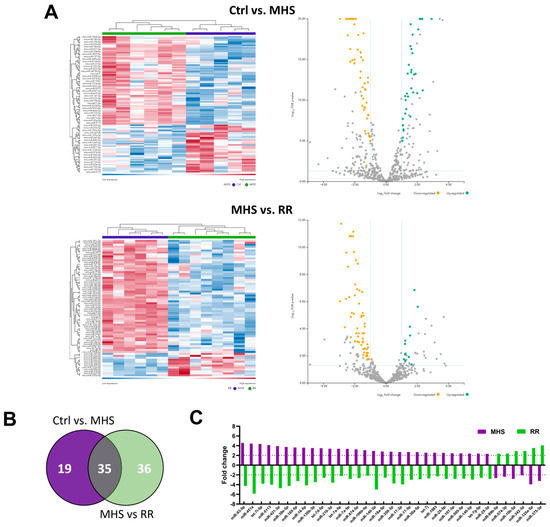 The plasma miRNome is completely normalised after RR. (A) Heat maps and volcano plots of differently expressed miRs after MHS (up) and RR (bottom). Green dots illustrate upregulated miRs, and yellow dots downregulated ones. Grey dots either had a fold change below ±2 or had a false discovery rate (FDR) over 0.5. (B) Venn diagram illustrating the number of modulated miRs between the control group and MHS and between MHS and RR groups. (MHS: purple and RR: green). (C) All miRs upregulated or downregulated between control and MHS (purple) are modulated in the opposite direction in the RR (green) group.