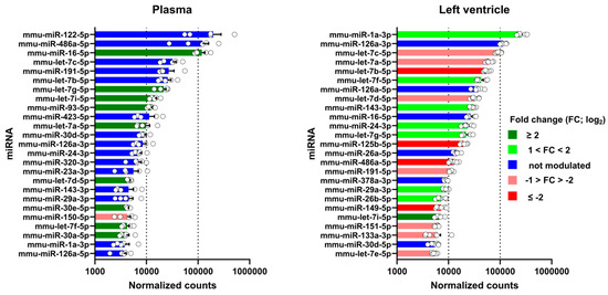 Using the normalised counts obtained from the miR sequencing, we listed the 25 most abundant miRs in the plasma and left ventricle (Figure 8). Seventeen of the twenty-five most abundant miRs in the plasma and the LV were identical. We determined their modulation, and only ten out of twenty-five were modulated in the plasma, all upregulated except for one. For the left ventricle, 19 of the most abundant miRs were modulated, 8 upregulated and 11 downregulated. Five of these were very strongly modulated (FC > ±2).