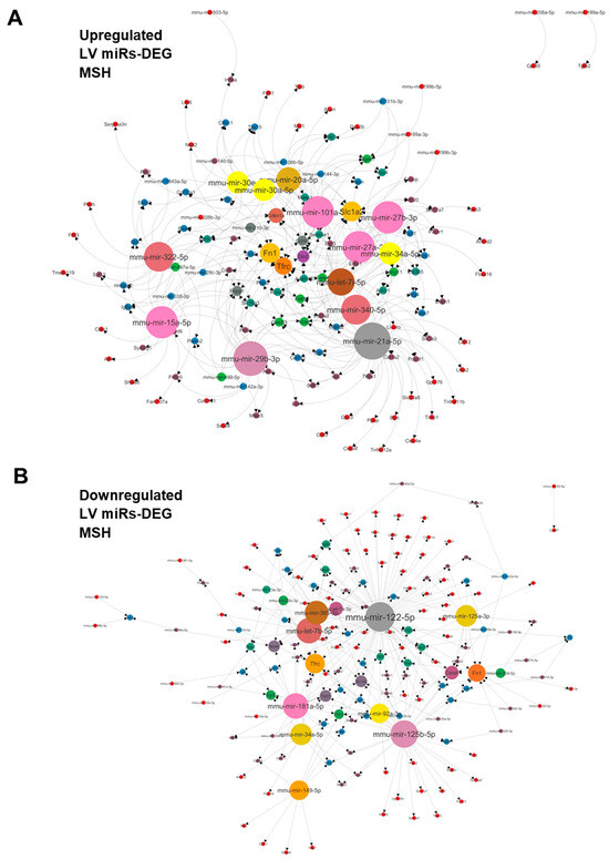(A) Interactome network of 34 strongly upregulated (+log22 FC) LV miRs vs. differentially regulated genes determined after a bulk RNA sequencing of the same LV RNA samples used for determining the miRNome of MHS LV compared to controls. This network was generated using the miRNet 2.0 analytical tool and Cytoscape to build the illustration. The number of possible interactions of miRs and genes determines the sizes of each dot on the network. (B) Interactome network of 49 strongly downregulated (−log22 FC) LV miRs vs. LV differentially regulated genes after MHS compared to controls.