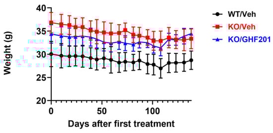 Weight over time in WT mice, Agl−/− (KO) mice injected intramuscularly biweekly with 10% DMSO solvent control, and KO mice injected in the same way with 250 mg/kg GHF-201. n = 8 WT/Veh, n = 6 KO/Veh, and n = 10 KO/GHF-201 mice were used. Throughout the period, KO mice were heavier than WT mice (p < 0.0001, Two Way ANOVA with repeated measures). Due to a >10% weight reduction between biweekly weightings, one mouse was removed from the KO/Veh group on day 116 after treatment initiation and one mouse was removed from the KO/GHF201 group on day 52 after treatment initiation.