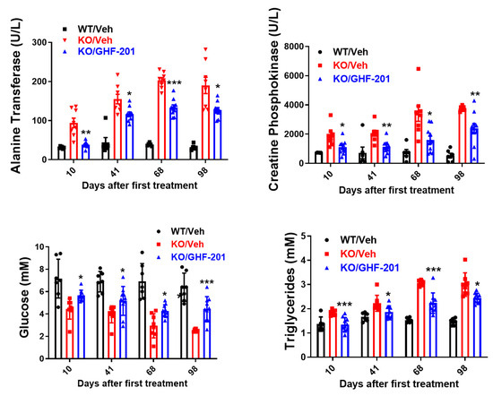 Blood metabolic panel based on n = 8 Agl−/− mice treated with 10% DMSO vehicle (KO/Veh), n = 6 wild type mice treated with vehicle (WT/Veh), and n = 10 Agl−/− mice treated with GHF-201, as indicated. At all time points, GHF-201 significantly reduced alanine transferase and creatine phosphokinase, demonstrating partial restoration of liver and muscle damages, respectively. Additionally, blood glucose was increased, and blood triglycerides were decreased by GHF-201 in treated Agl−/− mice. Statistical significance between KO/Veh and KO/GHF-201 at the different time points was determined by Two Way ANOVA with repeated measures with a Tukey post hoc test according to simple effects within rows (i.e., times). *, 0.01 < p < 0.05; **, 0.001 < p < 0.01; ***, p < 0.001.