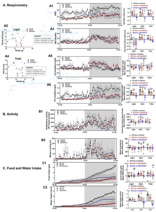 Indirect calorimetry and metabolic cage analysis. Following a 48 h habituation period, mice (n = 4 from each study arm indicated) were monitored over a 24 h period. Data are mean ± SEM from eight-month-old mice. ((A)—Respirometry) As demonstrated by the positive mean differences, in the light, dark, and overall (total), vehicle-treated Agl−/− mice demonstrate lower respiratory exchange ratio (RER, (A1)), total energy expenditure (TEE, (A2–A4)), and carbohydrate oxidation (A6). As shown by the negative mean differences, fat oxidation was reduced in Agl−/− mice in light, dark, and overall as compared to WT mice (A5). All these parameters were increased or corrected by GHF-201 at all times, except for fat oxidation in the dark and overall (A4). ANCOVA results suggest that weight-dependent TEE is reduced in Agl−/− compared to WT mice in both the light condition (A2) and overall (A4), and that GHF-201 corrects this TEE reduction in Agl−/− mice in the light. ((B)—Activity) Ambulatory activity (B1) and wheel running (B2) were also increased (corrected), or not affected, by GHF-201 as indicated. ((C)—Food and Water Intake) Food intake (C1) was not significantly affected, and water intake ((C2), total cumulative values are shown in the bar graphs) was increased, mainly in the dark period, by GHF-201. Statistical significance of mean differences was determined by One Way ANOVA with repeated measures with a Tukey post hoc test. *, 0.01 < p < 0.05; **, 0.001 < p < 0.01; ***, p < 0.001; ****, p < 0.0001; ns, non-significant.