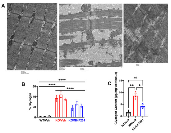 (A) Representative transmission electron microscopy images of longitudinal sections of gastrocnemius muscle collected from 8-month-old animals treated as indicated. Note granular glycogen material interspersing sarcomeres in the section from untreated Agl−/− mouse. Also note variable width of sarcomeres in Agl−/− mouse sample. These ultrastructural phenotypes were partially corrected in GHF-201-treated Agl−/− mouse. (B) Quantification of area percent of glycogen based on analysis of TEM images from n = 3 animals. ****, significant differences between arms (p < 0.0001, Two Way ANOVA (factors are “animal” and “arm”) with Tuckey post hoc correction). (C) Biochemical quantification of Gastrocnemius glycogen. Glycogen levels in muscle tissues collected from n = 3 mice/arm were determined by Merck’s glycogen assay kit and statistically analyzed by One Way ANOVA with Tuckey post hoc correction. *, p < 0.05; **, p < 0.01, ns, p < 0.08.