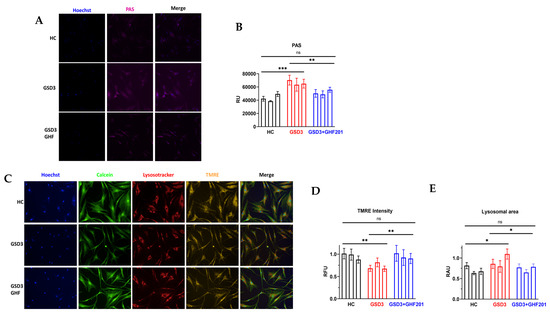 Skin fibroblasts from 3 GSD3 and 3 HC individuals were cultured in 96-well plates for 48 h in starvation medium without FBS and glucose. Subsequently, cells were live-stained with (A,B) PAS reagent to quantify intracellular glycogen, or (C–E) a mix of fluorescent dyes which included Hoechst, Calcein-AM, TMRE, and Lysortracker red to, respectively, stain nuclei (blue), cytoplasm (green), respiring mitochondria (yellow), and lysosomes (red). Multiple images from the live-stained cells were automatically obtained by an Operetta G1 image analyzer under environmentally controlled conditions. Shown are representative images and their quantification in relative units. Statistical significance of differences was determined by Two Way ANOVA with Tuckey post hoc correction. *, p < 0.05; **, 0.001 < p< 0.01; ***, p < 0.001; ns, not significant.