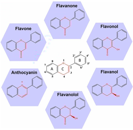 Flavonoids constitute a major group of secondary polyphenolic metabolites that naturally occur in the plant kingdom. They represent one of the most structurally versatile compounds, accounting for more than 9000 reported in the literature [1]. The reason for their versatility lies in their core chemical structure, which consists of a fifteen-carbon skeleton, two benzene rings (A and B), and a heterocyclic ring (ring C) (Figure 1). Their structure allows for a large number of substitutions that lead to several subcategories of flavonoids such as flavonols, flavones, flavanones and many more, each of them displaying different biological activities [2,3]. Researchers have already demonstrated that their biological activities towards plants and humans, such as antioxidative, anti-inflammatory and antibacterial activity, are associated with their structural variation [4].