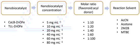 To investigate the optimal conditions for the enzyme-mediated modification of flavonoids, the following parameters were tested in this order: the concentration of nanobiocatalysts, the molar ratio (flavonoid:acyl donor) and the reaction solvent (Figure 2).