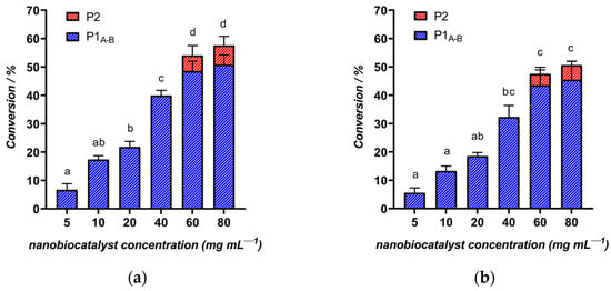 Conversion yield (%) of myricetin with (a) CaLB-ZnOFe and (b) TLL-ZnOFe, influenced by the concentration of nanobiocatalysts (mg mL−1) in MTBE after 72 h of reaction time. The molar ratio of myricetin:vinyl acetate was 1:40 for both cases; the reaction temperature was set to 50 °C. Means with the same letter are not statistically significant according to Tukey’s multicomparison test (at p > 0.05).