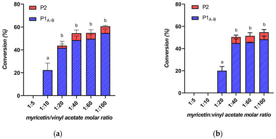 Conversion yield (%) of myricetin with (a) CaLB-ZnOFe and (b) TLL-ZnOFe influenced by the molar ratio between myricetin and vinyl acetate after 72 h of reaction time in MTBE. The optimal concentration of the nanobiocatalyst was used (60 mg mL−1), and the reaction temperature was set to 50 °C. Means with the same letter are not statistically significant according to Tukey’s multicomparison test (at p > 0.05).