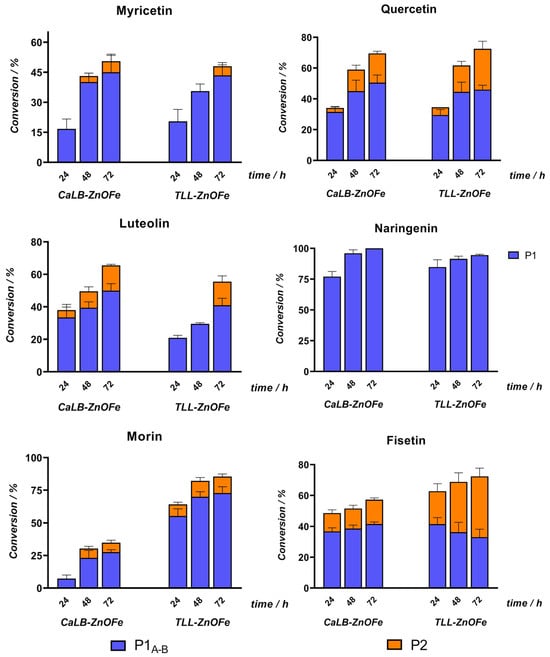 The ability of CaLB-ZnOFe or TLL-ZnOFe to catalyze the acetylation of various dietary aglycon flavonoids, which display numerous biological activities, was also investigated. As can be seen in Figure 5, the conversion yield depended on the aglycon flavonoid and the nanobiocatalyst used. The formation of mono- and diesters was observed for the acetylation of all flavonoids tested except for naringenin, where only a monoester was detected (Figure 5). Naringenin was 100% converted to 4′-naringenin acetate by both CaLB-ZnOFe and TLL-ZnOFe after 48 h of incubation, which was in accordance with that reported elsewhere using the commercial lipase B from Candida antarctica (Novozyme 435), albeit with a lower conversion yield compared with both CaLB-ZnOFe and TLL-ZnOFe conjugates [22]. Moreover, the high regioselective acetylation of naringenin observed here contrasts with that reported by Chebil et al., [39] where lipase from Pseudomonas cepaciae (PCL) produced naringenin 4′-acetate and naringenin 7,4′-diacetate esters, indicating the effect of the biocatalyst used on the regioselectivity of the reaction. Additionally, from Figure 5, it can be seen that the amount of the flavonoids’ diesters produced was associated with the conversion of aglycon flavonoids and the formation of the monoacetylated derivatives, which is in accordance with that reported elsewhere for the enzymatic acylation of various glucosylated flavonoids [48].