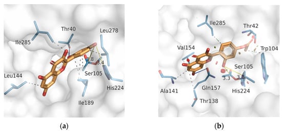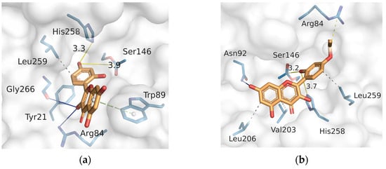 According to the docking results, the productive binding mode of morin shares some similarities with that of CaLB. More specifically, the B ring is oriented towards the catalytic site of TLL with the 4′-OH group in proximity to the Ne2 atom of His258 (Figure 7a). In this orientation, the B ring partakes in hydrophobic interactions between Tyr21 and Leu259, and a hydrogen bond with the catalytic His258, which facilitates proton transfer; thus, higher yields of 4′-acetate could be achieved, as was demonstrated in the experimental results. Additionally, multiple interactions helped stabilize the rest of the structure in this catalytically active conformation (Figure 7a, Table S4). Compared with CaLB, the heterocyclic ring is positioned in the solvent’s environment, which could possibly facilitate the rate of diffusion of the final product.