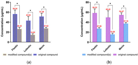Antimicrobial activity of fisetin, luteolin, morin and their derivative esters against (a) E. coli and (b) C. glutamicum. Modified compounds represent the 3′-acetate and 4′-acetate esters in the case of fisetin and luteolin, and the 4′-acetate esters in the case of morin. Mean values are represented by red color above the error bars. Asterisks indicate statistically significant differences according to a t-test (p < 0.05).