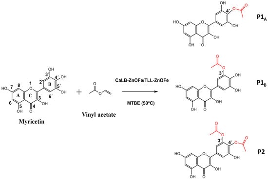 Acetylation reaction of myricetin by CaLB-ZnOFe and TLL-ZnOFe. The acetylated groups are show in red.