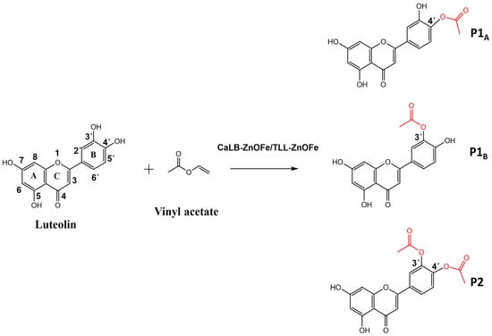 The acetylation reaction of luteolin by CaLB-ZnOFe and TLL-ZnOFe. The acetylated groups are shown in red.