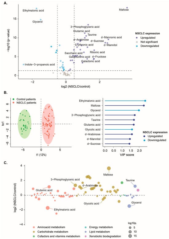 Comparative analysis of plasma metabolite profiles in non-small cell lung cancer (NSCLC) patients and the control group. (A) Differential expression of plasma metabolites revealed significantly upregulated and downregulated metabolites in patients compared to the control group. (B) Orthogonal Partial Least Squares Discriminant Analysis showed a clear distinction between the metabolic profiles of NSCLC patients and healthy individuals, with eight metabolites exhibiting a Variable Importance in Projection (VIP) score greater than 1.5. (C) The most significant metabolites distinguishing NSCLC patients from the control group were associated with amino acid, carbohydrate, and lipid metabolism.
