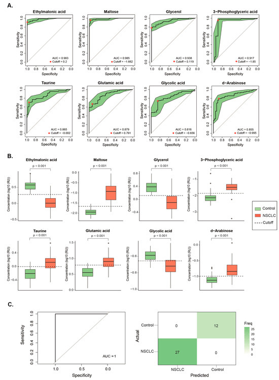 Plasma concentrations of ethylmalonic acid, maltose, glycerol, 3-phospogyceric acid, taurine, glutamic acid, glycolic acid, and d-arabinose had a high discriminating power to classify non-small cell lung cancer (NSCLC) patients from the control group. (A) Individual Receiver Operating Characteristics (ROC) curves showed an area under the curve (AUC) higher than 0.8. Red dots represent the optimal cutoff value determined by the Youden index for patient classification. (B) The Mann–Whitney U test revealed significant differences in plasma metabolite concentrations between NSCLC patients and healthy individuals. (C) The Support Vector Machine multivariate model showcased outstanding performance, with an ROC curve achieving an AUC of 1 and an unequivocal confusion matrix. Results and cutoffs are shown as log10 of Relative Units (RU).